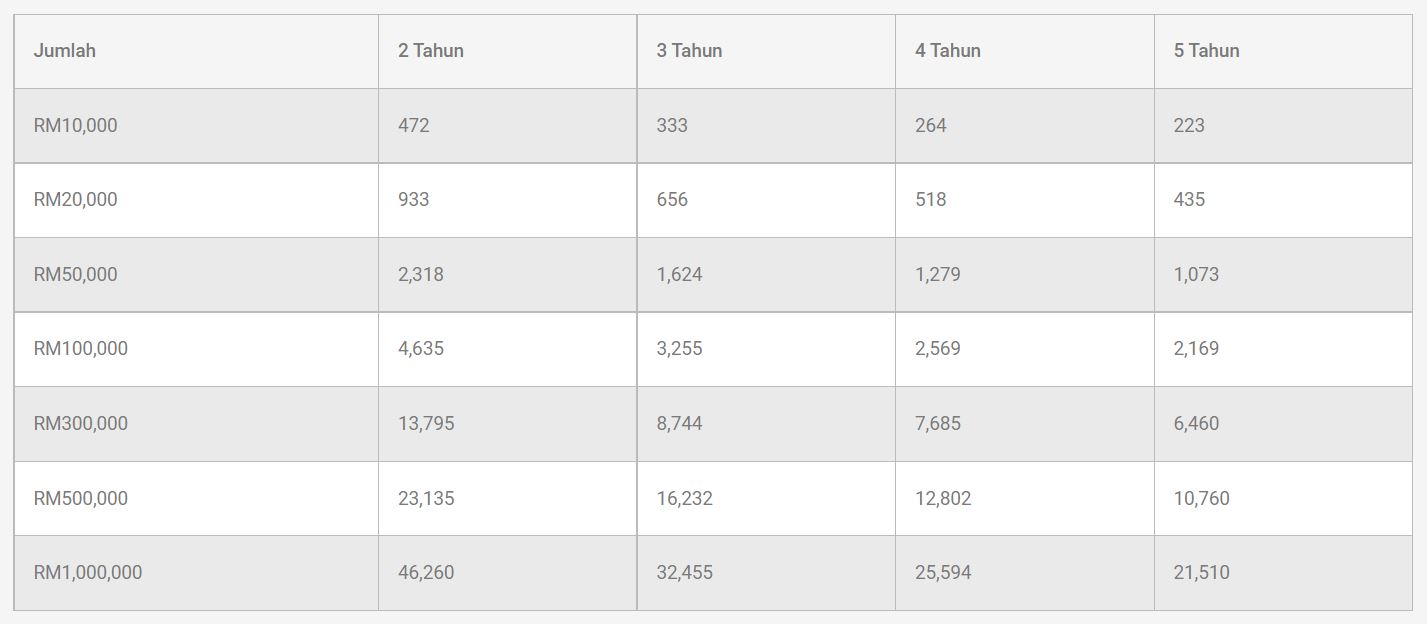 2 bulan – 5 tahun tempoh pembayaran balik. 10% – 16% kadar faedah tahunan